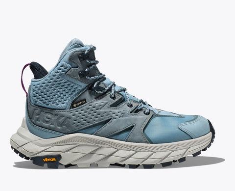 Hoka Anacapa Mid Gtx-Schuhe für Damen. Der Anacapa Mid GORE-TEX ist ein Wanderschuh, der mit nachhaltigen Methoden hergestellt und für Wochenendabenteuer konzipiert wurde und Ihnen ermöglicht, die Natur in vollen Zügen zu erleben. Dieses vielseitige Modell besteht aus leichtem, von der Leather Working Group zertifiziertem Leder und verfügt außerdem über einen Kragen, ein Netzgewebe und Schnürsenkel aus teilweise recyceltem Polyester. Dieser wasserdichte Wanderstiefel verfügt über eine Fersenschlaufe und eine Einlegesohle auf 50 % Sojabasis. Er verfügt über GORE-TEX-Technologie und recyceltes Material, das Ihren Fuß auch bei Nässe angenehm und trocken hält. Der Anacapa Mid GORE-TEX ruht auf einer Vibram® Megagrip-Sohle für hervorragende Traktion auf unebenem Untergrund.