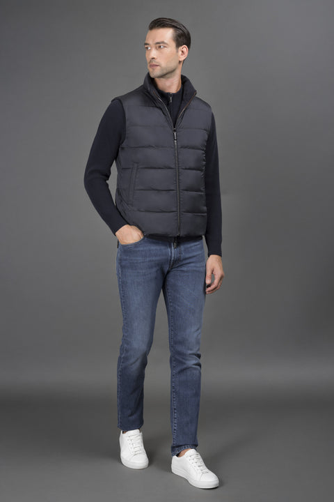 Reversible vest made from extra fine brushed Australian flannel, crafted from a wool and cashmere blend, with a soft and comfortable feel. One side of the garment is quilted in boudin and filled with down, while the other side is smooth.